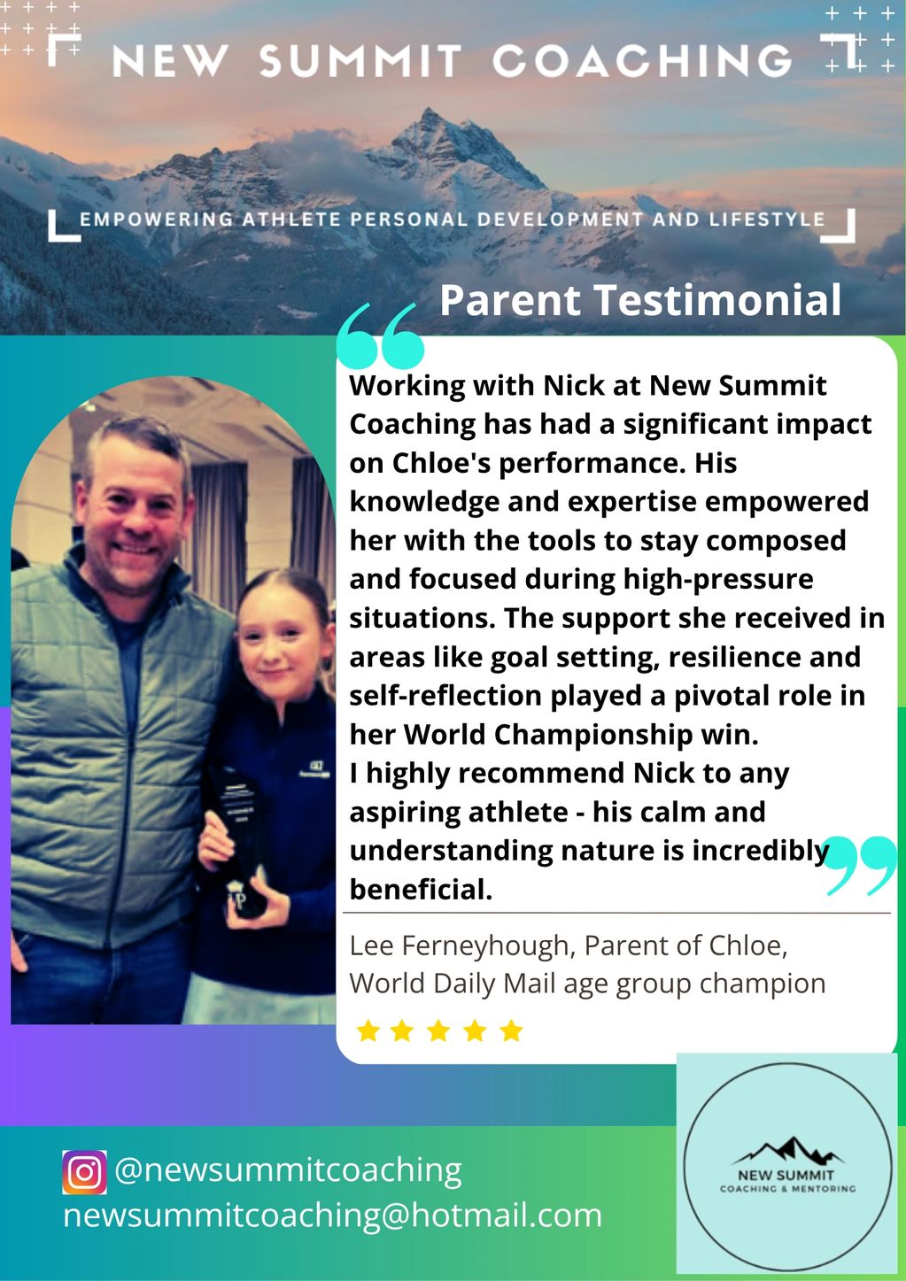 It was amazing to work with rising golf star Chloe, helping her develop techniques to set ambitious goals and bounce back from setbacks on the course. Read from her dad, Lee, about how this support guided Chloe on her way to winning her age-group World Championship.